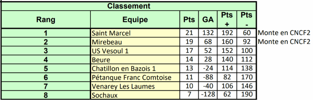 | Venarey Les Laumes | Pétanque Franc Comtoise | 14 | 22 |